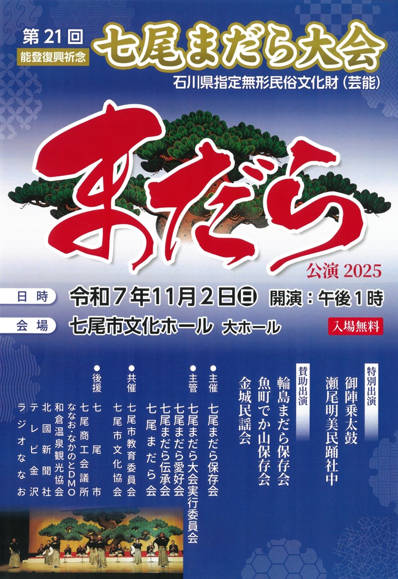 催物案内:令和7年11月2日(日) 第21回 七尾まだら大会 能登復興祈念 石川県指定無形民俗文化財(芸能)