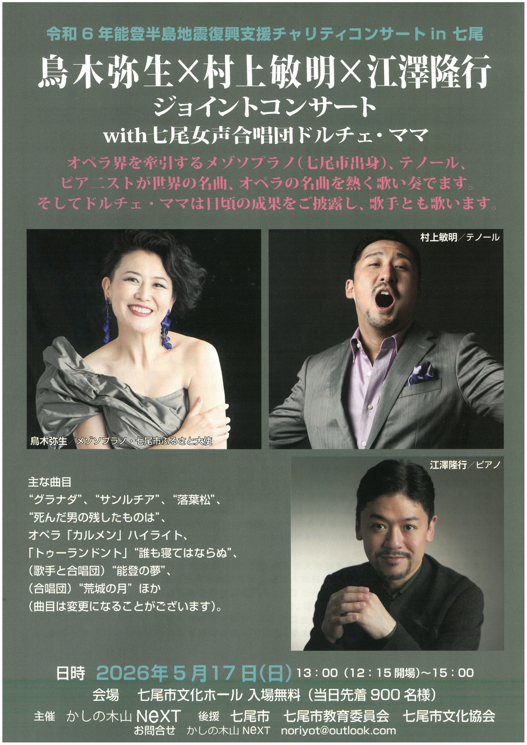 催物案内:令和8年5月17日(日) 鳥木弥生☓村上敏明☓江澤隆行 ジョイント・コンサートwith七尾女声合唱団ドルチェ・ママ